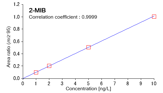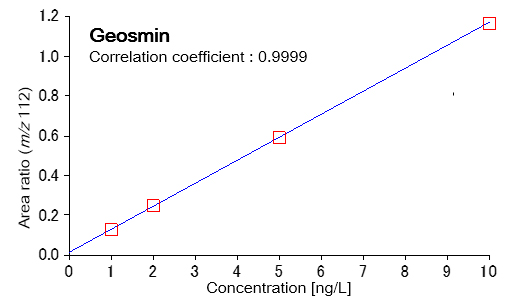 使用捕集型顶空装置 MS-62071STRAP 和气相色谱质谱仪 JMS-Q1600GC UltraQuad™ SQ-Zeta 进行测量。通过将浓度为 1、2、5 和 10 ng/L 的 2-MIB 和土臭味素添加到含有 45 g 氯化钠和 10 mL 纯化水的顶空小瓶中来制备样品。作为内标物质,添加2,4,6-三氯苯甲醚-d3至浓度为20ng/L。表1显示了样品的测量条件。