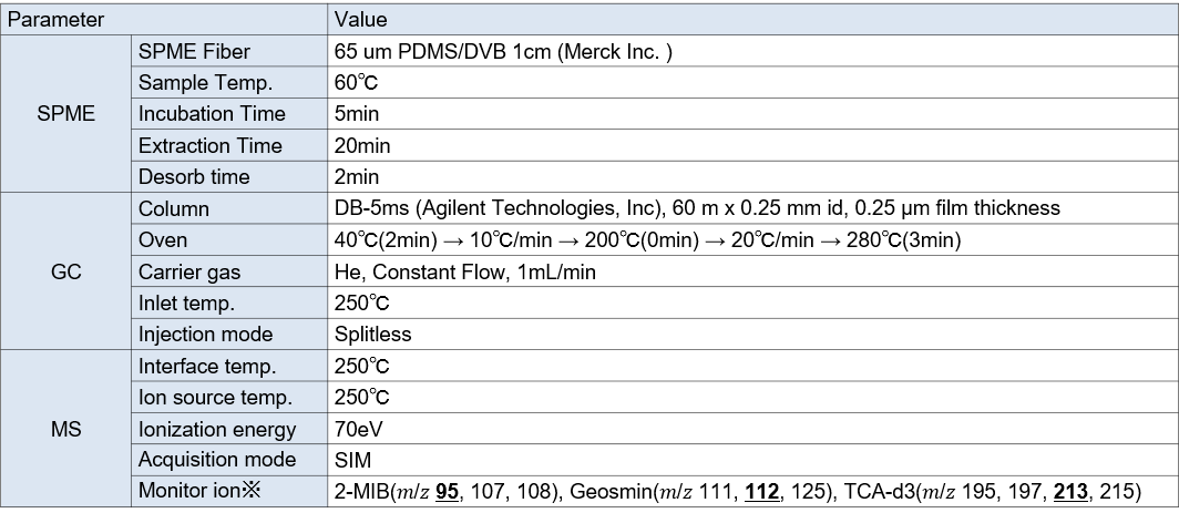 Solid phase microextraction (SPME) is a method for extracting and concentrating volatile components generated from liquid or solid samples Since the entire amount of the collected volatile components is injected, highly sensitive measurements are possible, and it is widely used for off-odor analysis In the "Method specified by the Minister of Health, Labor and Welfare based on the provisions of the Ministerial Ordinance on Water Quality Standards," the SPME method is specified as Annex 27-2 as an analysis method for 2-Methylisoborneol (→2-MIB) and Geosmin, which are substances that cause mold odor This time, we measured the mold odor-causing substances using the SPME-GC-MS method and confirmed the carryover, accuracy, and precision of the calibration curve based on the "Guidelines for Validity Evaluation of Tap Water Quality Testing Methods" and will report the results