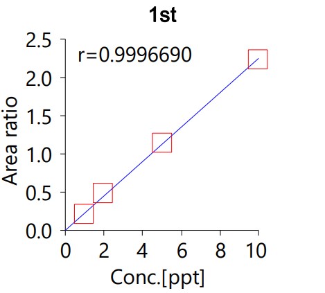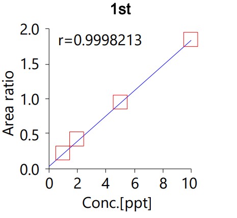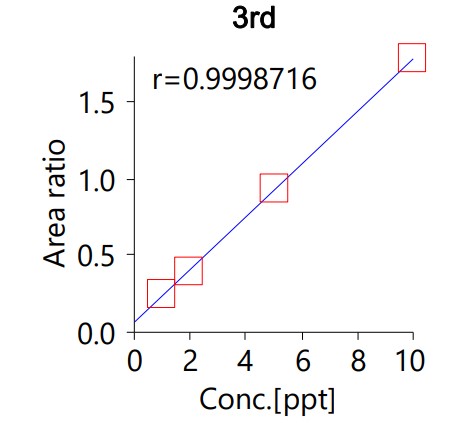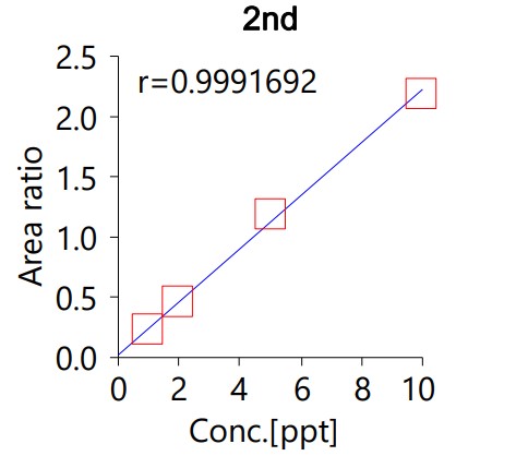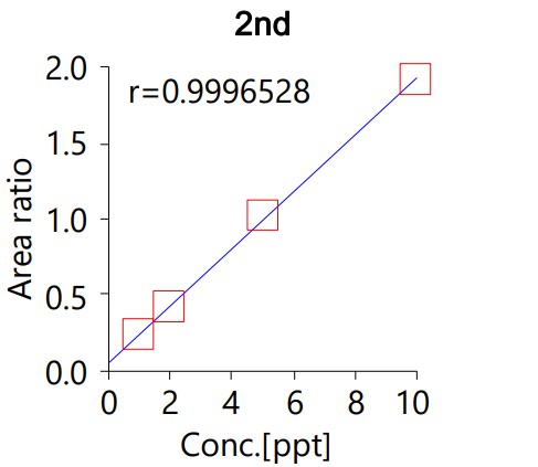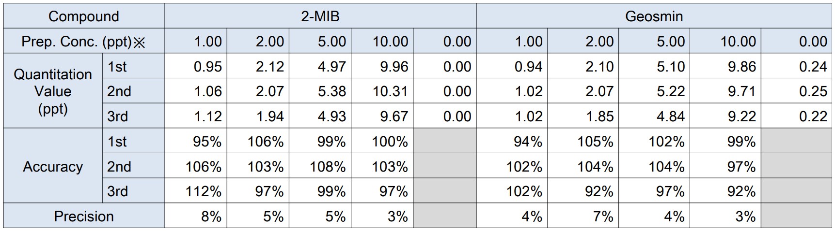 2-MIB和土臭素样品在每个浓度下进行了n=3次试验,每次重复的校准曲线如图1和图2所示。此外,表2显示了根据第一次重复的校准曲线计算出的每个浓度点的准确度和精密度,以及最高浓度点测量后的残留值。关于校准曲线的线性,2-MIB和Geosmin在每次重复中均获得了良好的线性,相关系数(r)均为0999以上。校准曲线的准确度在所有浓度点被确认为制备浓度的80%至120%,并且在每个浓度点的准确度被确认为20%或更少的相对标准偏差。关于残留,已确认每次重复测量最高浓度点后的定量值低于1 ppt,这是校准曲线的下限浓度。