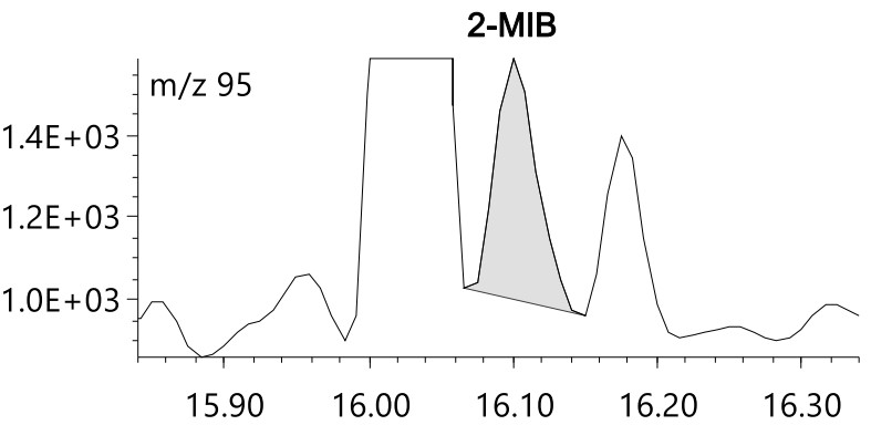 第一次重复时校准曲线下限浓度对应的SIM色谱图如图3所示。可以看出,即使在校准曲线下限浓度(=1 ppt)(水质标准值的1/10)下,2-MIB和土臭素也与周围峰充分分离,可以毫无问题地检测到。