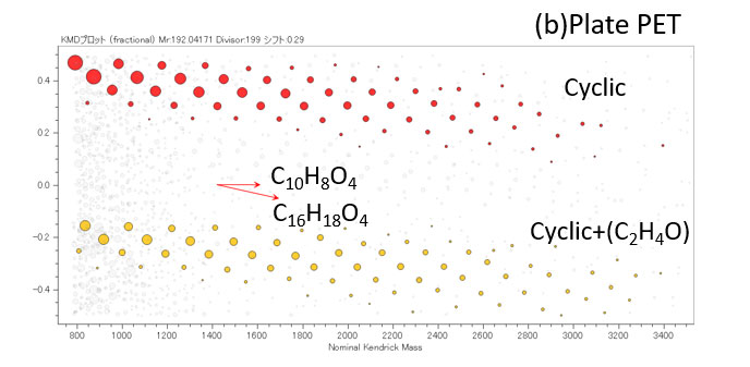 图3显示了薄膜状PET和板状PET的质谱。 PET薄膜主要含有环状低聚物[M+Na]+(图3a)。从板状 PET 中获得的质谱比从膜状 PET 中获得的质谱更复杂。由于之前报道[1]中板状PET为G-PET,C10H8O4(192042u) 和 C16H18O4(274121u)その結果、マススペクトルには19 2uと274uの繰り返し単位をもつポリマーシリーズが複数含まれていることが分かった以这种方式,即使在低聚物区域中也获得了与从反应热解GC-TOFMS和NMR获得的结构一致的信息。 On the other hand, since detailed analysis is difficult especially from the mass spectrum of plate-shaped PET, KMD analysis was performed