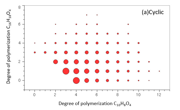 图4显示了薄膜状PET和板状PET的质谱KMD图(基本单元C10H8O4,除数 199)。图4a是薄膜状PET的KMD图,并且由于在水平轴上观察到水平系列,C10H8O4的PET均聚物。端基分析结果主要表现为环状结构和环状结构+(C2H4O)是[M+Na]+图4b显示了板状PET的KMD图,观察到了两个网格状系列。这些是 C10H8O4(192042u) 和 C16H18O4(274121u)的一系列共聚物。另外,从两个晶格系列的KMD图上的位置,我们可以看到循环结构和循环结构+(C2H4O) の構造であることがわかった。 The degree of polymerization plot for these two structures is shown in Figure 5 It was found that both polymerization degree plots showed the same tendency另外,根据聚合度图,C10H8O4和 C16H18O4的摩尔比计算得出(括号中的 C)10H8O4)均聚物的计算值。结果,当计算乙二醇与环己烷二甲醇的比率时,该比率约为7:3。