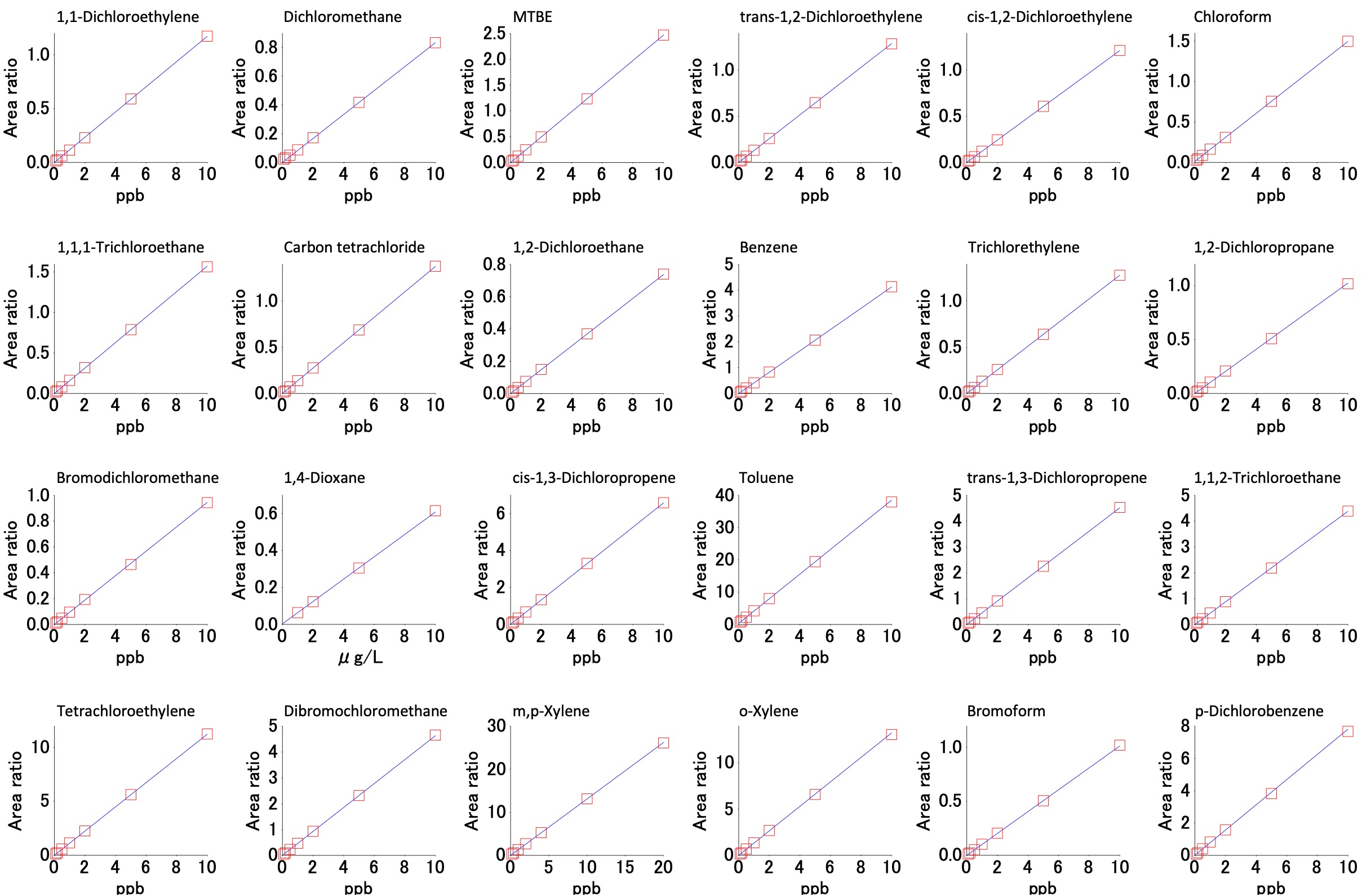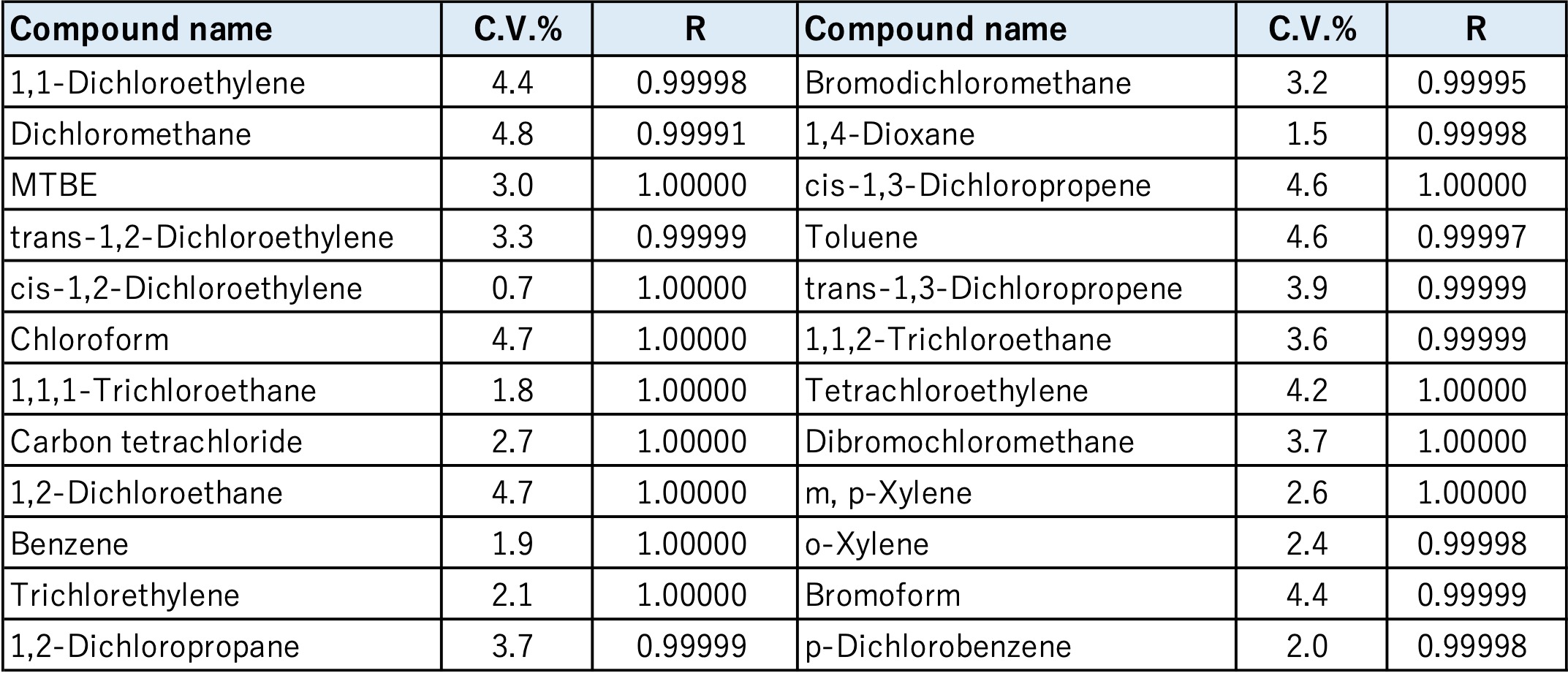 测量不同浓度的样品(1,4-二恶烷:1,2,5,10ppb,其他VOC:01,02,05,1,2,5,10ppb),创建的校准曲线如图1所示。此外,表3显示了校准曲线的变异系数(CV)和相关系数当连续测量5次样品接近各种法律法规规定的定量下限(1,4-二恶烷为1ppb,其他VOCs为01ppb)时。