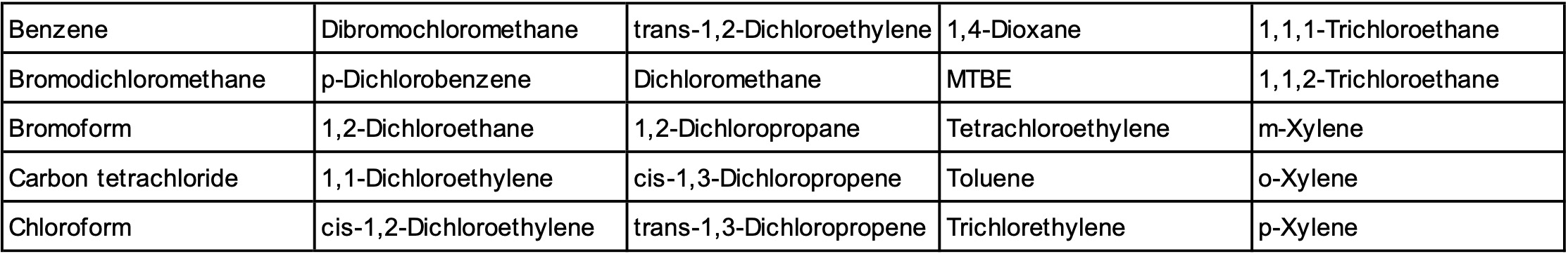 图 2 浓度为 01 µg/L 的每种 VOC 和浓度为 1 µg/L 的 1,4-二恶烷的 SIM 色谱图