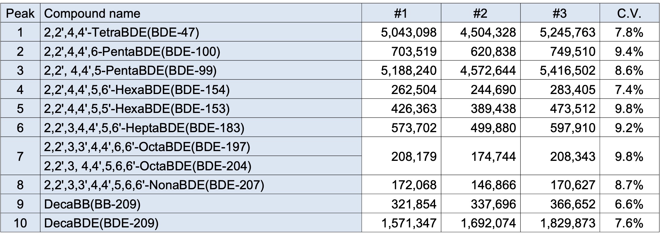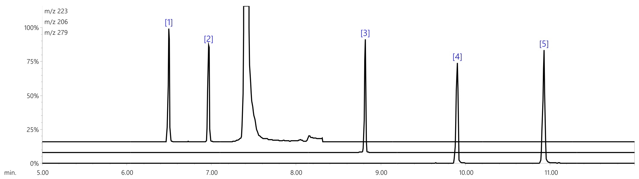 图1显示了测量ERM®-EC591时目标成分的SIM色谱图,表2显示了连续测量n=3次试验时目标成分的峰面积值与称量值的比率(→重量面积比)和重量面积比的变异系数(CV)。同样,图2显示了使用NMIJ CRM 8152-a测量时目标成分的SIM色谱图,表3显示了重量面积比和CV。连续测量 n=3 次试验时的目标成分。在各样品的SIM色谱图中,可以以足够的强度检测到目标成分的峰,并且CV对于所有目标组分,通过称重值归一化的重量面积比均小于 20%。