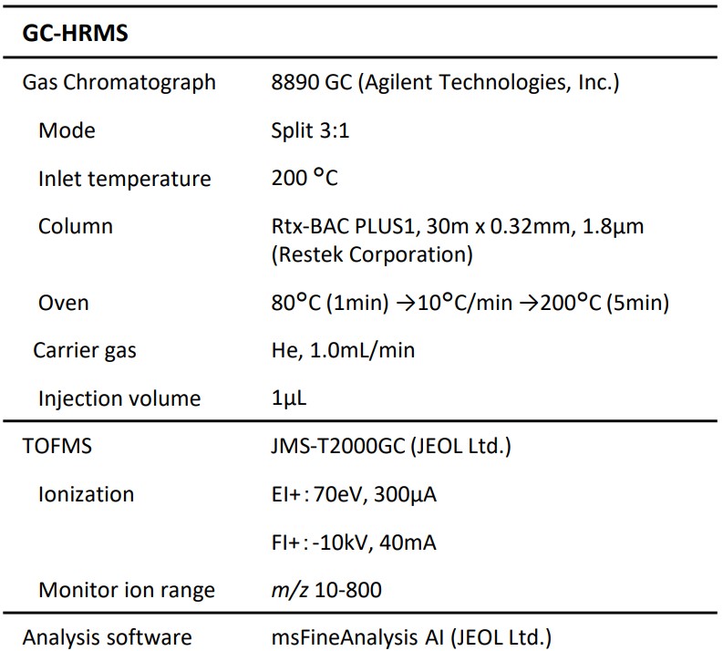 使用市售PGMEA(≥995%)作为样品。由于与 PGMEA 类似的高极性成分被认为是杂质成分,因此使用 Rtx-BAC PLUS1 作为 GC 柱。电离方法为EI法,SI采用FI(场电离)法,分析采用msFineAnalysis AI。详细测量条件如表1所示。