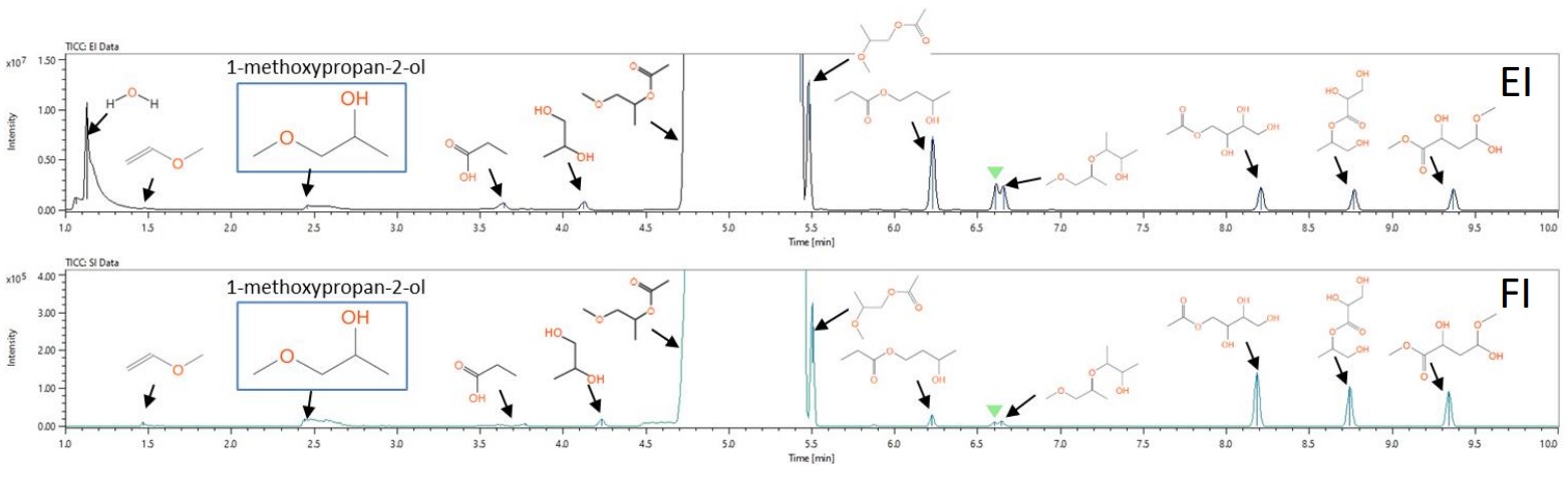 EI和FI的总离子流色谱图(TICC)如图1所示。除了空气和PGMEA之外,还检测到12种被认为是杂质的成分。从 EI 和 FI TICC 中鉴定出了除空气和水以外的成分。在分析过程中,存在一些由分子离子估算的成分与NIST数据库搜索结果中估算的化合物不匹配的成分。但是,msFineAnalysis AI 不仅拥有 NIST 数据库,还拥有 AI 根据化合物结构预测的 EI 质谱数据库。使用AI数据库,碎片离子模式与分子离子推导出的组成式匹配良好的化合物作为分析结果如图所示。容易混合到PGMEA和1-甲氧基丙-2-醇中的水分子,用作PGMEA合成的原料[1]经确认为杂质成分。乙酸2-甲氧基丙酯也被确认为杂质成分。