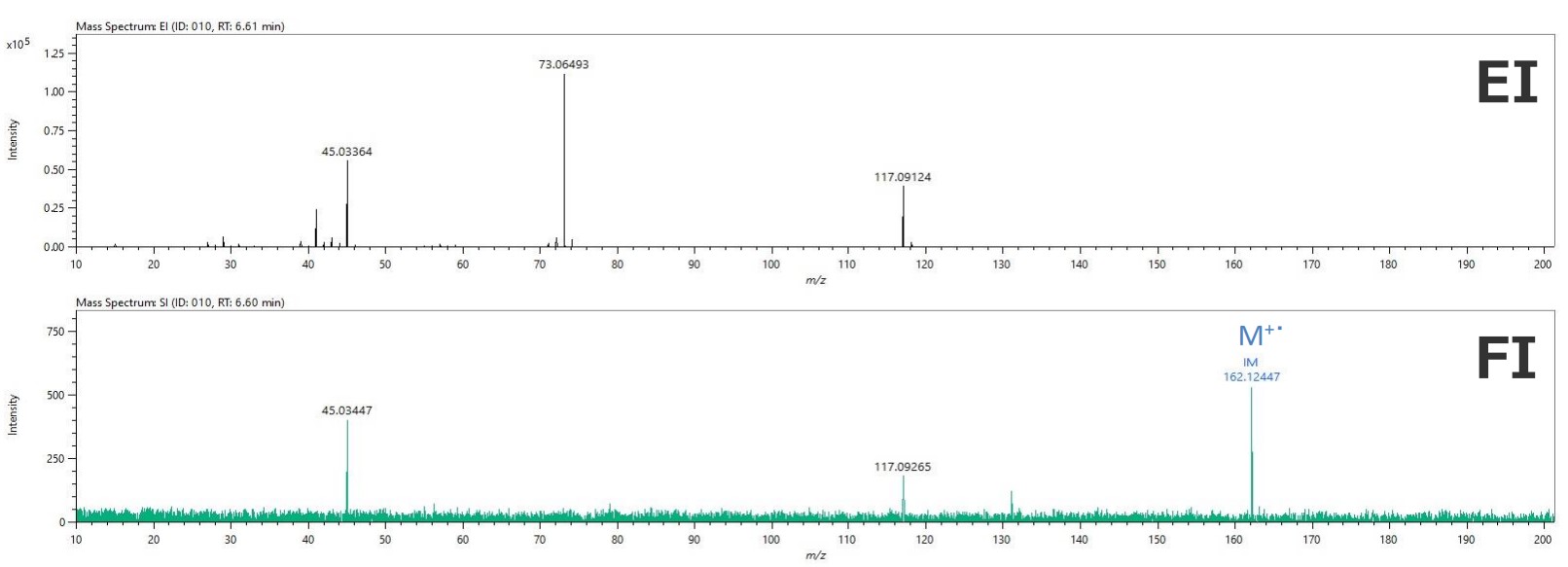 图 2 保留时间 661 分钟组分的 EI 和 FI 质谱Upper: EI, Lower: FI