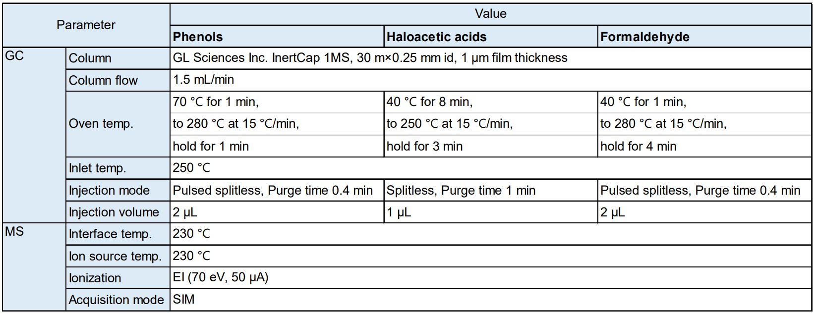 使用气相色谱四极杆质谱仪“JMS-Q1600GC UltraQuad™ SQ-Zeta”进行测量。测定条件如表1所示。如上所述,使用的色谱柱相同,并且通过改变GC条件来测量每种化合物。另外,MS的SIM采集中分析的各成分的监测离子,使用了“厚生劳动大臣根据有关水质标准的省令(以下简称告示法)的规定规定的方法”中记载的值。
