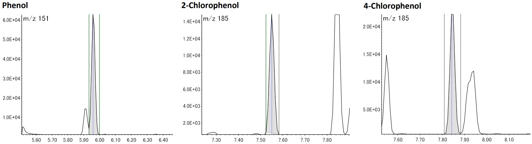 酚类分为苯酚、2-氯苯酚、4-氯苯酚、2,6-二氯苯酚、2,4-二氯苯酚、2,4,6-三氯苯酚六种,标准值为各成分的总和换算为苯酚量5μg/L。图 1 显示了 005 µg/L 时的 SIM 色谱图,该值小于标准值的 1/10。