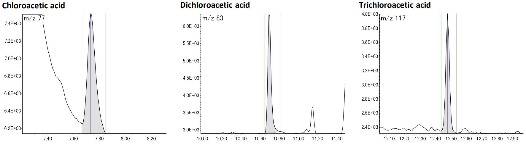 卤代乙酸的标准值为:氯乙酸为 20 µg/L,二氯乙酸和三氯乙酸为 30 µg/L。图 3 显示了 2 µg/L 浓度下的 SIM 色谱图,该浓度低于标准值的 1/10。