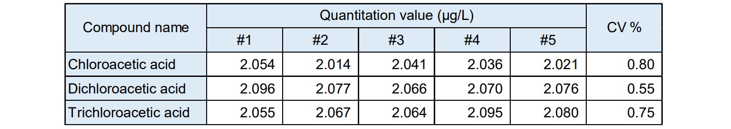 各卤乙酸的校准曲线和以n=5连续测定2μg/L样品时定量值的变异系数分别如图4和表3所示。校准曲线的线性度良好,测定系数为0999以上,低于定量下限的2μg/L定量值的变异系数为1%以下。