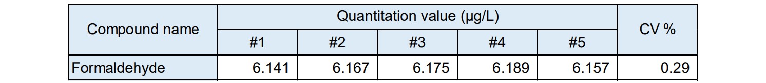 甲醛标准值为80 µg/L。图 5 显示了 6 µg/L 时的 SIM 色谱图,该浓度小于标准值的 1/10。另外,图6和表4显示了在n=5时连续测量6μg/L样品时得到的甲醛校准曲线和定量值的变异系数。校准曲线的线性良好,测定系数为0999以上,低于定量下限的6μg/L定量值的变异系数为1%以下。