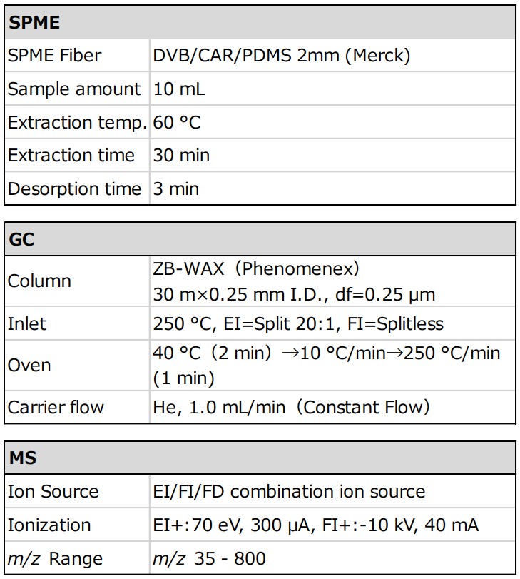 使用的样品是通过压榨美国柠檬获得的柠檬汁。将 10 mL 柠檬汁密封在 20 mL 小瓶中。使用自动进样器HT2850T(HTA制造)的SPME模式作为样品前处理装置,测定小瓶顶部空间的挥发性成分。 GC-MS测定使用GC-TOFMS(JMS-T2000GC AccuTOF™GC-Alpha、日本电子株式会社制造)。 MS离子源采用EI/FI/FD共用离子源,电离法和软电离法采用EI法和FI法。使用msFineAnalysis AI(JEOL制造)对获得的数据进行分析。其他详细测量条件如表1所示。