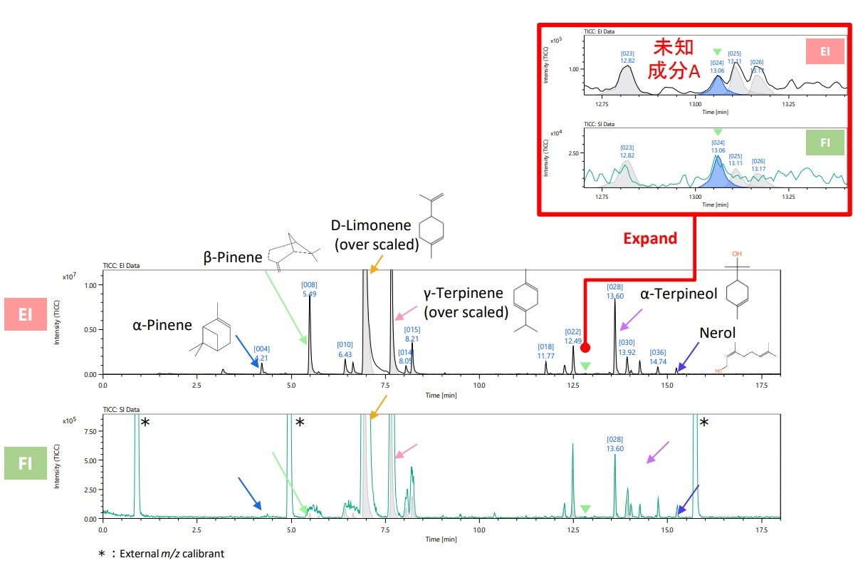 图1显示了柠檬汁测量结果的总离子流色谱图(TICC)。通过反卷积总共检测到 37 个成分。检测到的成分为单萜类化合物(C10H16)、单萜醇,例如 α-萜品醇和橙花醇 (C10H18O)是主要香气成分。在这37种成分中,有3种成分与库DB的相似度为700以下,推测为DB未注册化合物(未知物质)。其中,对RT 13分钟左右检测到的化合物(未知组分A,图1)进行了详细分析,最后进行了AI结构分析。
