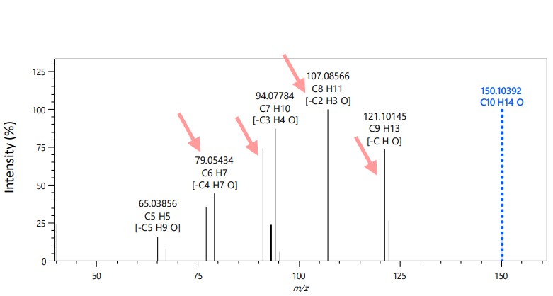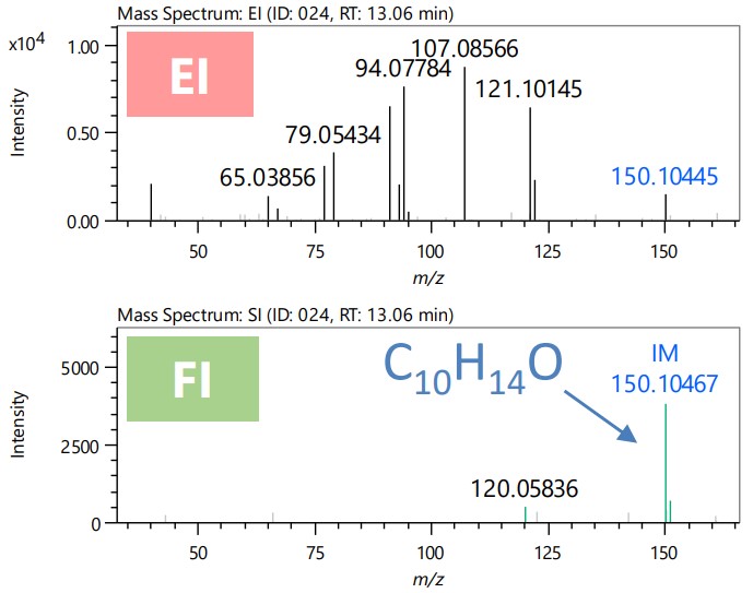 图2显示了未知物质A的质谱。对于该组分,分子离子m/z检测到 150 个。然而,在作为软电离方法的FI方法中,分子离子的相对强度较高并且可以作为基峰被检测到。估算该分子离子的组成的结果是,该成分的分子式为 C10H14估计是O。