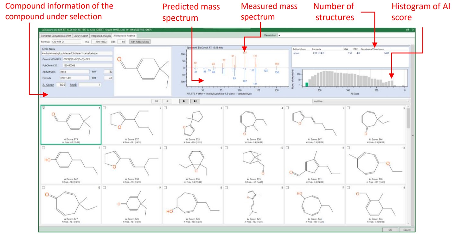 众所周知,食品的香气成分是与味道相关的重要因素,腐臭等异味成分也是与食品品质相关的重要因素。气相色谱-质谱联用仪 (GC-MS) 通常用于分析这些食品的香气成分,因为它们具有高度挥发性且含有多种成分。在 GC-MS 定性分析中,通常通过使用电子电离 (EI) 方法的测量数据搜索库数据库 (DB) 来鉴定化合物。然而,截至2023年,美国国立卫生研究院管理的PubChem DB(无EI质谱信息)中已注册了超过1亿种化合物,而美国国家标准与技术研究院(NIST)最新发布的数据库中仅注册了约35万种化合物的EI质谱信息。换句话说,这些未登记在质谱库DB中的化合物被视为未知物质。对于这些DB未注册的化合物,“综合分析”是有用的,这种定性分析方法使用了通过EI法获得的两个质谱和容易给出分子离子和质子化分子的软电离法。此外,通过使用能够精确质量测量的飞行时间质谱仪(TOFMS)进行数据采集,可以估计通过软电离获得的分子离子的组成,最终可以确定未在数据库中注册的未知化合物的分子式。1)使用TOFMS的综合分析还提供了通过EI方法获得的碎片离子和中性损失的组成公式,使得获得部分结构信息成为可能。结合该部分结构信息和分子式信息可以分析化合物的结构。然而,最终的结构估计需要分析者自己的考虑,这项工作需要质谱和化学知识,以及大量的时间。这次,我们开发了一种结合深度学习的质谱预测的综合结构分析方法,解决了使用GC-MS数据进行手动结构分析的困难2)我们开发了配备74049_74292|(以下简称AI结构分析)的“msFineAnalysis AI,未知物质自动结构分析软件”。在AI结构分析中,将上述EI法和软电离法数据综合分析得到的分子式信息与上述模型得到的预测质谱相结合,可以自动、快速地推算出未知物质的结构式。在此 MSTips 中,我们将报告一个使用 msFineAnalysis AI 进行结构分析来分析柠檬汁中未知物质的示例。