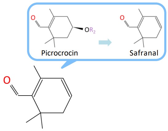 图3显示了未知物质A(前18个候选物质)的AI结构分析结果。在种类繁多的结构式中,AI结构分析结果中排名第一(与AI库相似度最高)的候选分子是单环单萜醛类化合物(图4)。文学3),“作为萜烯和萜烯衍生化的碎片离子特征m/z生成79、93、107、121”,这也从该组分的EI质谱中得到证实(图5)。此外,未知成分A是一种单环单萜醛,其结构类似于藏红花香气的主要成分藏红花醛(图6)。已知番红花醛是通过单萜糖苷苦藏红花素水解产生的4)(图6),有人提出,未知物质A也可能是藏红醛等香气成分。如上结果所示,未知组分A的结构可以通过AI结构分析来估计。