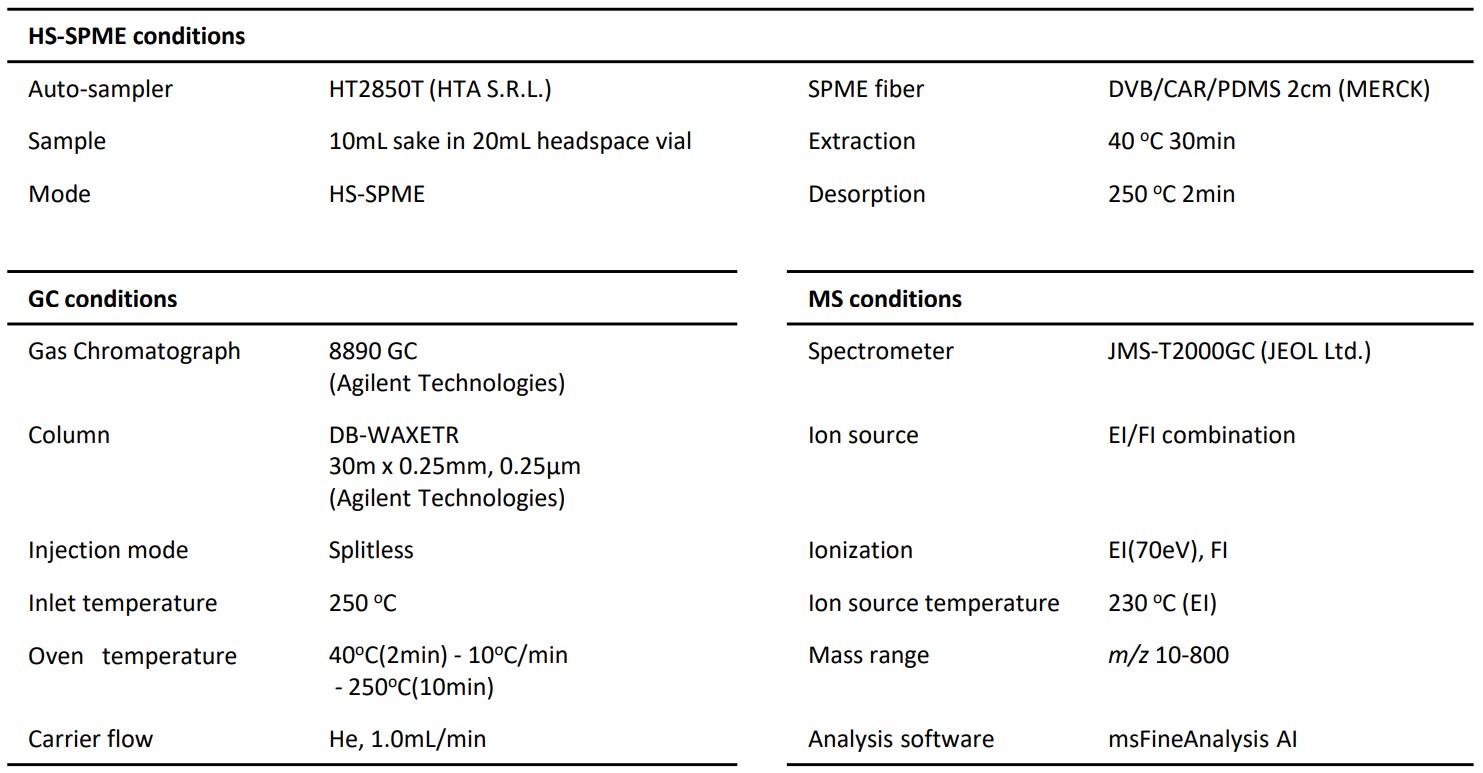 使用市售本酿酒和吟酿酒作为样品,并将各 10 mL 密封在 20 mL 顶空瓶中(图 1)。使用 HT2850T 在 40°C 下进行 HS-SPME 萃取 30 分钟,并使用 JMS-T2000GC 测量 EI/FI(图 2)。对于数据分析,使用了 msFineAnalysis。使用 AI,我们对每个样本的 n = 3 次测量进行了定性分析和统计差异分析。表 1 显示了测量条件的详细信息。