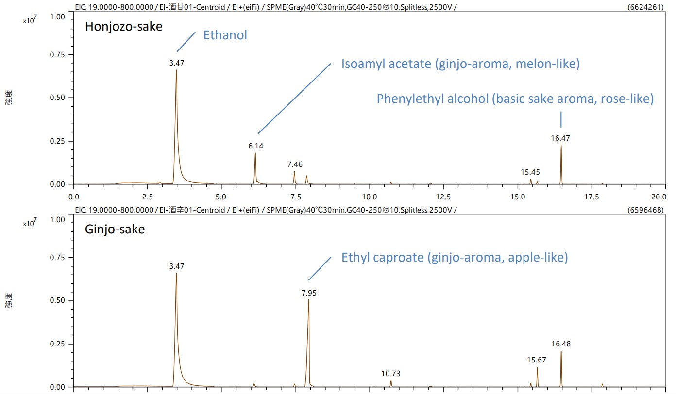 图 3 显示了 Honjozo 清酒和 Ginjo 清酒的 TIC 色谱图。本酿酒中检出乙醇、乙酸异戊酯(吟酿香气、甜瓜香气)、苯乙醇(清酒香气、玫瑰香气)。在吟酿清酒中强烈检测到己酸乙酯(吟酿香气,类似苹果的香气)。