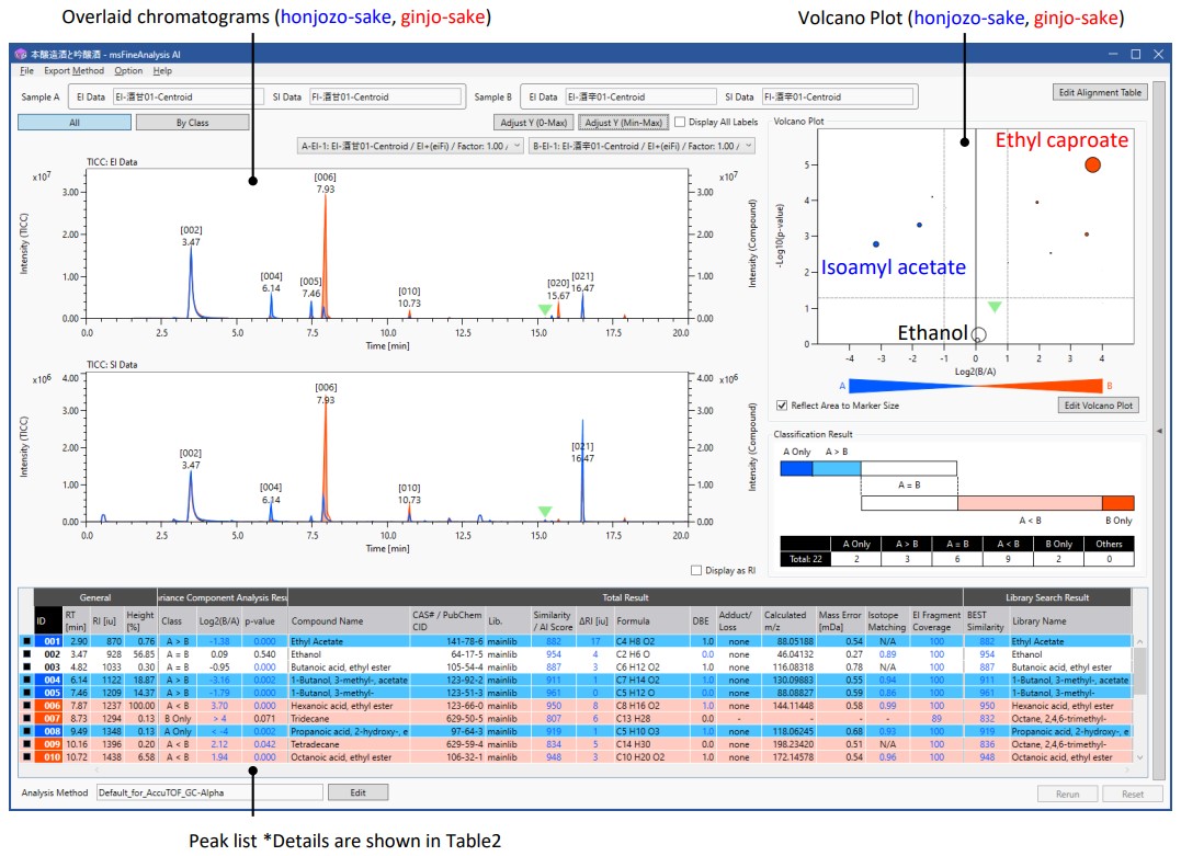 图 4 显示了使用 msFineAnalysis AI 对 Honjozo 清酒和 Ginjo 清酒之间的差异分析结果。在与最大峰的强度比达到01%的22个峰中,在本酿酒中强烈检测到5个峰,在吟酿酒中强烈检测到11个峰。从统计差异分析得到的火山图,可以直观地确认每个样品的特征成分。