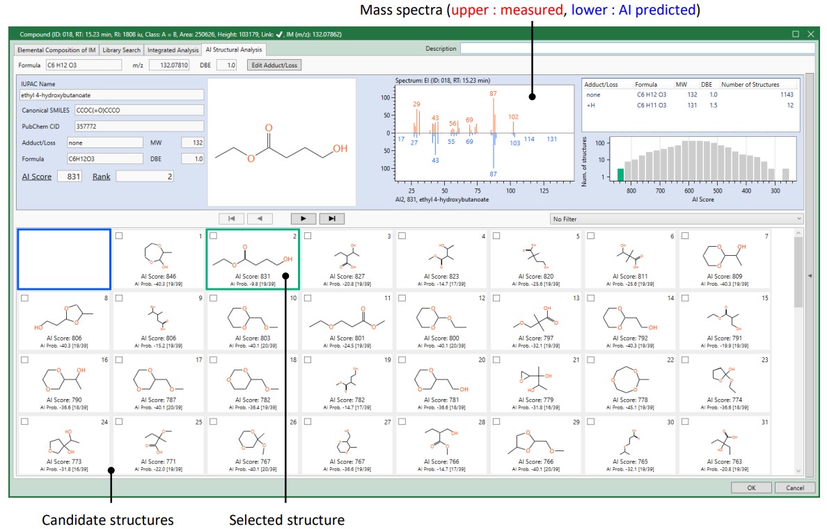 图5显示了ID018的AI结构分析得到的候选结构式。具有焦糖样香气的 4-羟基丁酸乙酯被列为最佳候选者(第二名/1155 名候选者)。