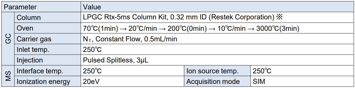 使用气相色谱质谱仪 JMS-Q1600GC UltraQuad™ SQ-Zeta 进行测量,LPGC-MS 色谱柱为 Restek Corporation 的 LPGC Rtx-5ms 色谱柱套件,内径 032 mm(目录号:11802)。表1显示了样品的测量条件。 MS的测定方法为SIM,SIM监测离子为水质管理目标设定项目农药(水质管理目标设定项目15)的对象农药列表中的附着方法5、附着方法5-2、附着方法25所涉及的134种成分。