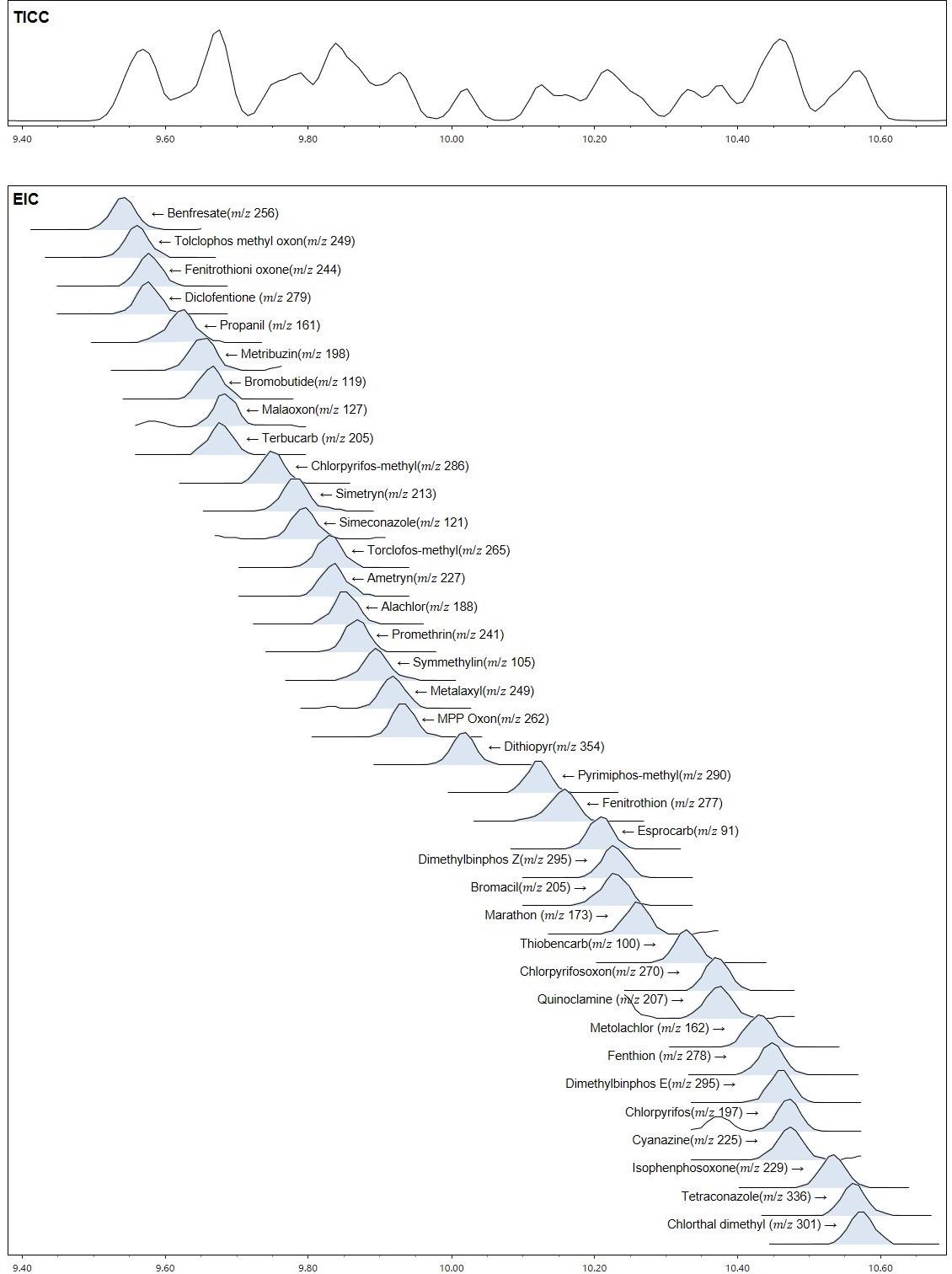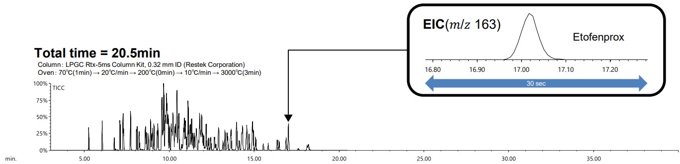 比较分析时间,在正常条件下使用 GC-MS 需要 40 多分钟的测量,在 LPGC-MS 条件下只需大约 20 分钟即可完成。关于峰宽度,通过比较依托芬菊的EIC,发现正常条件下的GC-MS和LPGC-MS条件下的峰宽度相当。尽管使用 TICC 很难分离洗脱峰,但使用 EIC 可以分离每种农药。图 4 显示了每种农药在 10 分钟左右的 EIC,此时大多数峰洗脱。