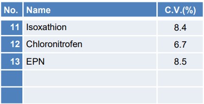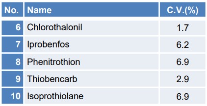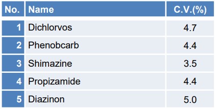 所有组分的下限浓度变异系数均小于10%,表明重现性良好,可以确认每种农药的色谱图都能以足够的强度进行检测。