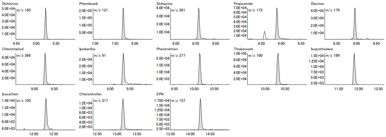 表 2 显示了在用于创建校准曲线和确认再现性的样品中,通过 n=5 次试验连续测量 10 µg/L 浓度时的定量值的变异系数 (CV)。此外,每种农药第一次重复的 SIM 色谱图如图 6 所示。