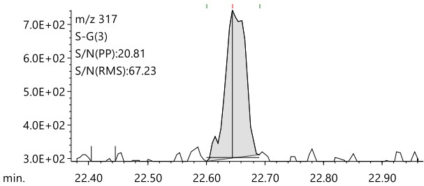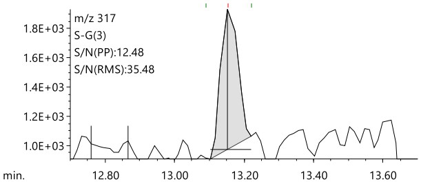 图 7 显示了浓度为 05 µg/L 的敌草醚的传统 GC-MS 和 LPGC-MS 的 EIC 比较结果。氯硝基苯的目标值是水中农药中最低的,即使按照通报法进行500倍浓度预处理后,供试品溶液的最终浓度也极低,仅为05μg/L。从图 7 的结果来看,使用氮气载气的 LPGC-MS 方法可以检测到 05 µg/L 处的氯硝基酚峰,并且信噪比 (S/N) 与正常条件下使用氦气的 GC-MS 方法的结果大致相同。