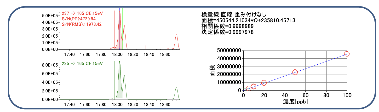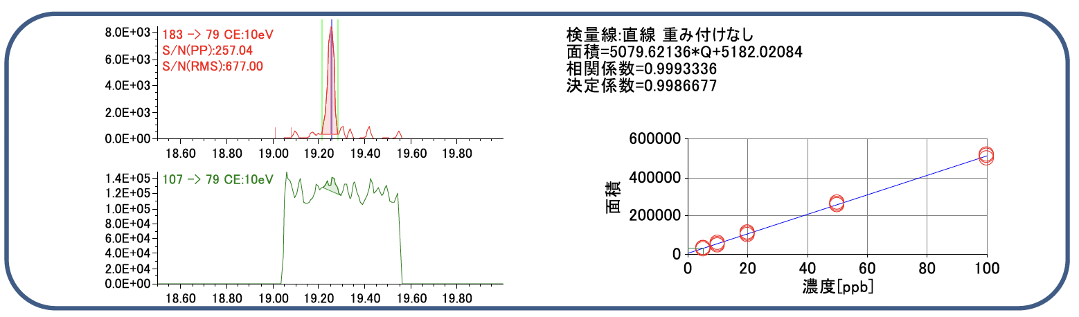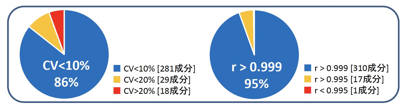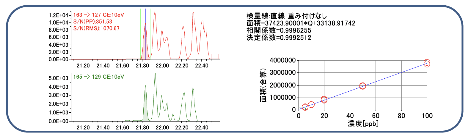 众所周知,当使用氮载体时,降低电离电压可以抑制氮离子的产生,从而可以提高检测灵敏度。一般测量条件下使用的电离电压为70V,但将此数据与20V设定的数据进行比较时,证实许多元件在设定为20V时具有更好的灵敏度,因此在本报告中,将电离电压设定为20V并进行测量。在设定为测量目标的 335 种成分中,总共有 328 种成分被确定在 5 ppb 浓度下可充分检测,并且校准曲线具有良好的线性。虽然可以检测到 5 ppb 的五种成分“安磺灵、苯磺硫酮、异恶硫磷、咪草苯甲酯和噻虫啉”,但我们确定在某些方面需要改进,例如校准曲线的线性、峰面积重现性或色谱图形状。在本研究中,有两种成分在 5 ppb 浓度下难以检测:虫螨吡和二恶硫磷。作为确定可测量的 328 种成分中的一个示例,图 1 至图 3 显示了三种成分的 5ppb EIC 和校准曲线:敌敌丹、氟氯氰菊酯和 p,p'-DDD。接下来,图 4 显示了确定可测量的所有 328 个组分的 5ppb 面积重现性 (n=3) 以及校准曲线的相关系数。328 个成分中的 310 个显示出良好的重现性,CV=20% 或更低。另外,校准曲线中相关系数为r=0999以上的成分数为310个,确认线性度没有问题。
