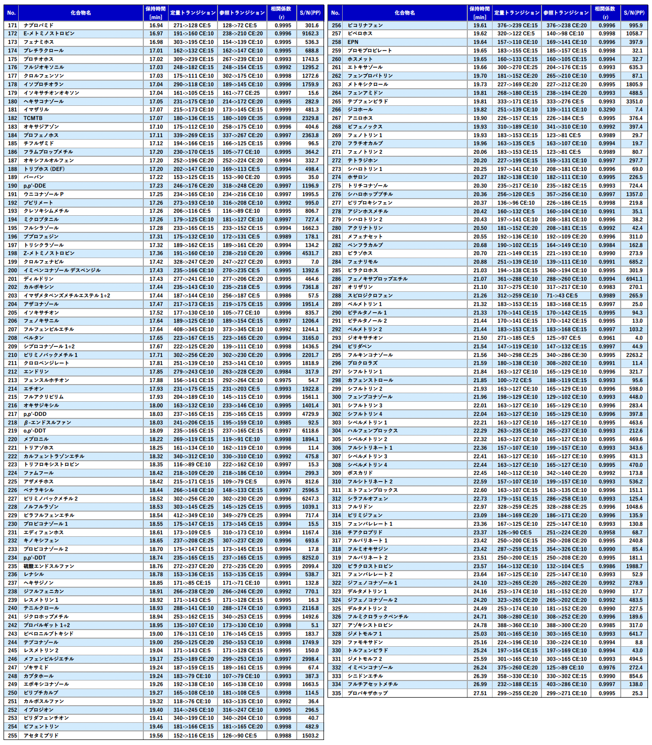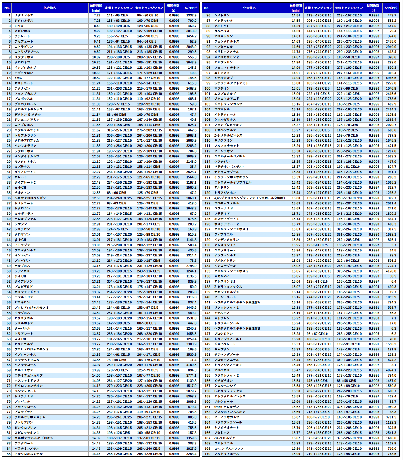 1。示例条件使用试剂:关东化学株式会社,Pesticide Mix Standard Solution 48、63、70、73、77、79、Pesticide-Mix 1598 样品制备:各1ppm 配制农药混合标准溶液(共测定335种成分) 配制农药混合标准溶液,样品浓度为:5、10、20、50、100ppb,并制作5点校准曲线 样品引入量:2μL(+伪基质:林纯药工业株式会社制造的SFA10mix的1μL共注射)