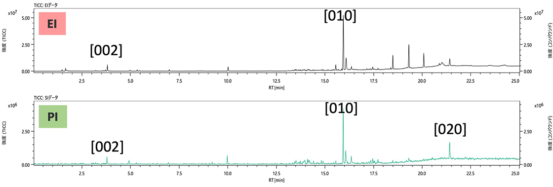 通常,对于 GC-QMS 的定性分析,通常使用电子电离 (EI) 方法的测量数据进行库数据库 (DB) 搜索。然而,如果仅使用与文库谱的相似度作为指标来进行定性分析,则可能根据化合物获得多个有意义的候选,或者可能选择错误的候选作为鉴定结果。使用SI法等软电离(SI)法来确认分子离子是有效的。