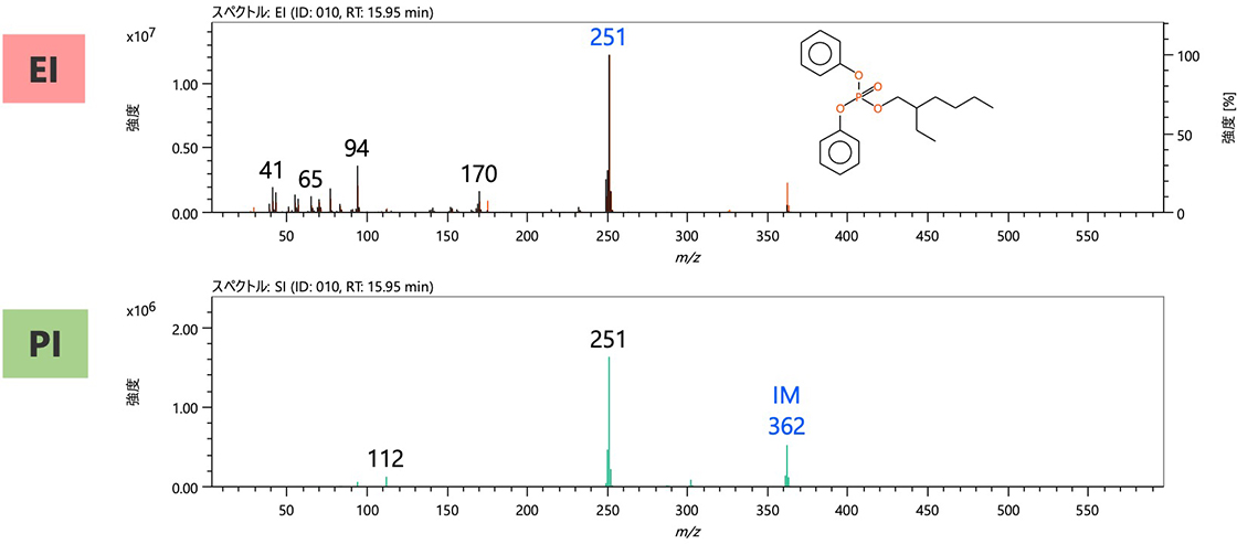 餐盒用抗菌片的热解吸GC/MS测定结果如图1所示。上排为EI法得到的总离子流色谱图(TICC),下排为PI法得到的。图 2 显示了色谱图中最强峰 [010] 的质谱。虽然在EI法中是微小信号,但在PI法中可以清楚地看到,推测为分子离子m/z可以检测到362个离子。此外,表 2 显示了 msFineAnalysis iQ 的综合分析结果(前 5 个候选)列表。根据该结果,峰[010]的成分被推定为“Octicizer”。推测该物质是为了软化作为该片材的基材的聚丙烯树脂而特意添加的增塑剂。