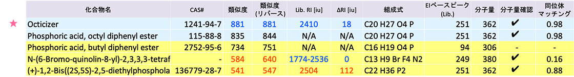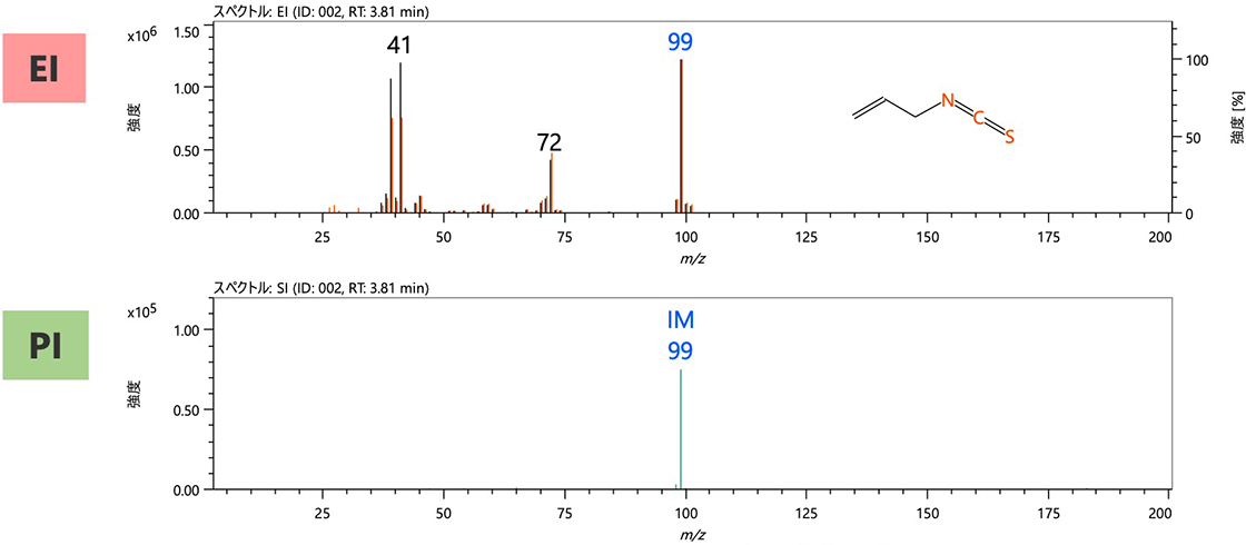 另外,峰[002]的质谱如图3所示。EI法和PI法均推算为分子离子m/z可以检测到99个离子。 msFineAnalysis iQ 的综合分析结果(前 5 名候选)列表如表 3 所示。检索结果中排名第一的“Ally Isothiocyanate”不仅具有相似度为 970 的优秀文库 DB 检索结果,而且具有 ΔRI = 25iu 和同位素匹配 = 097 的高精度估计结果。该成分是典型的“芥末提取物”成分。由于该成分是挥发性成分,因此在测量过程中需要使用微喷射冷冻系统进行捕获。峰[020]的其他成分是分子离子m/z662,分子量较大,推测为“磷酸三(2,4-二叔丁基苯基)酯”。该成分是食品级树脂中使用的典型抗氧化剂。此外,我们还能够检测和定性分析多种添加剂成分,包括典型抗氧化剂BHT、紫外线吸收剂三辛精、天然树脂松香成分松香酸及其相关化合物。