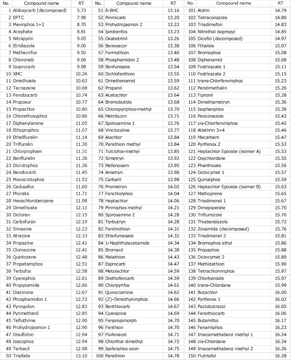 在设定为测量目标的总共 292 种成分中,在热不分流模式下总共可以检测到 01 ppb 的 283 种成分。下一页显示了 283 种可检测组分的化合物名称和保留时间列表。共有 9 种浓度为 01 ppb 的成分被确定为使用常规方法难以检测的:速克利、啶虫脒、哈芬普、咪苯唑醇、联苯醚、氟微酸戊酯、嘧菌酯、啶虫脒和噻虫啉。