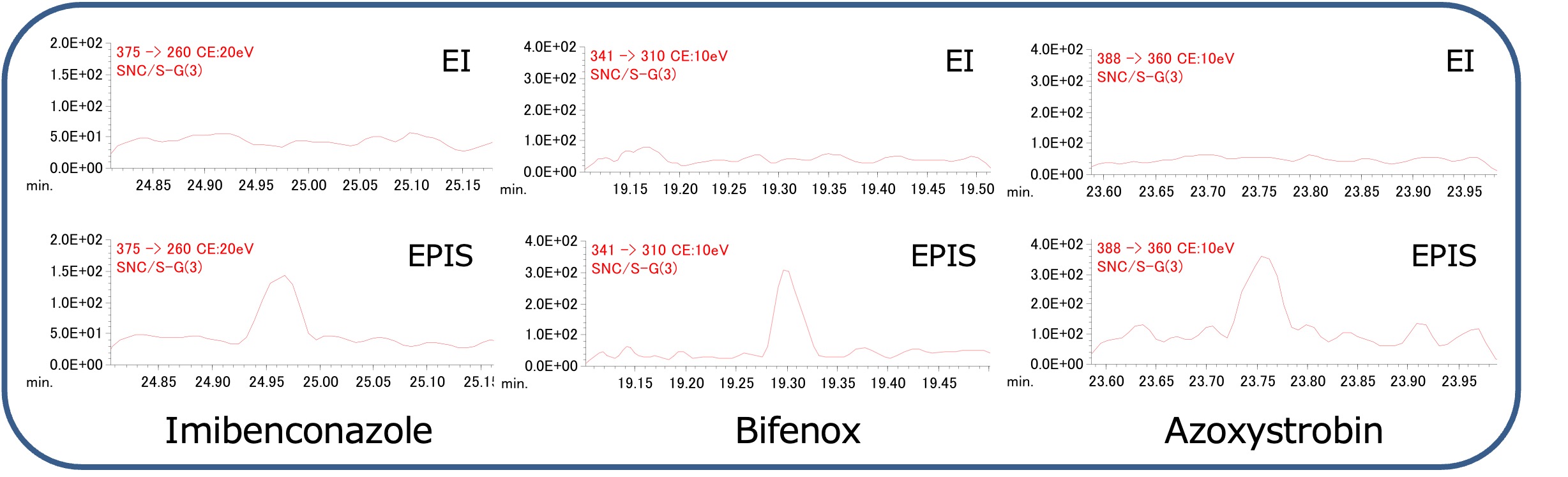 作为标准 EI 离子源难以检测的九种成分的示例,图 1 显示了三种成分(亚胺苯唑、联苯醚和嘧菌酯)在 01 ppb 时的 EIC 比较。