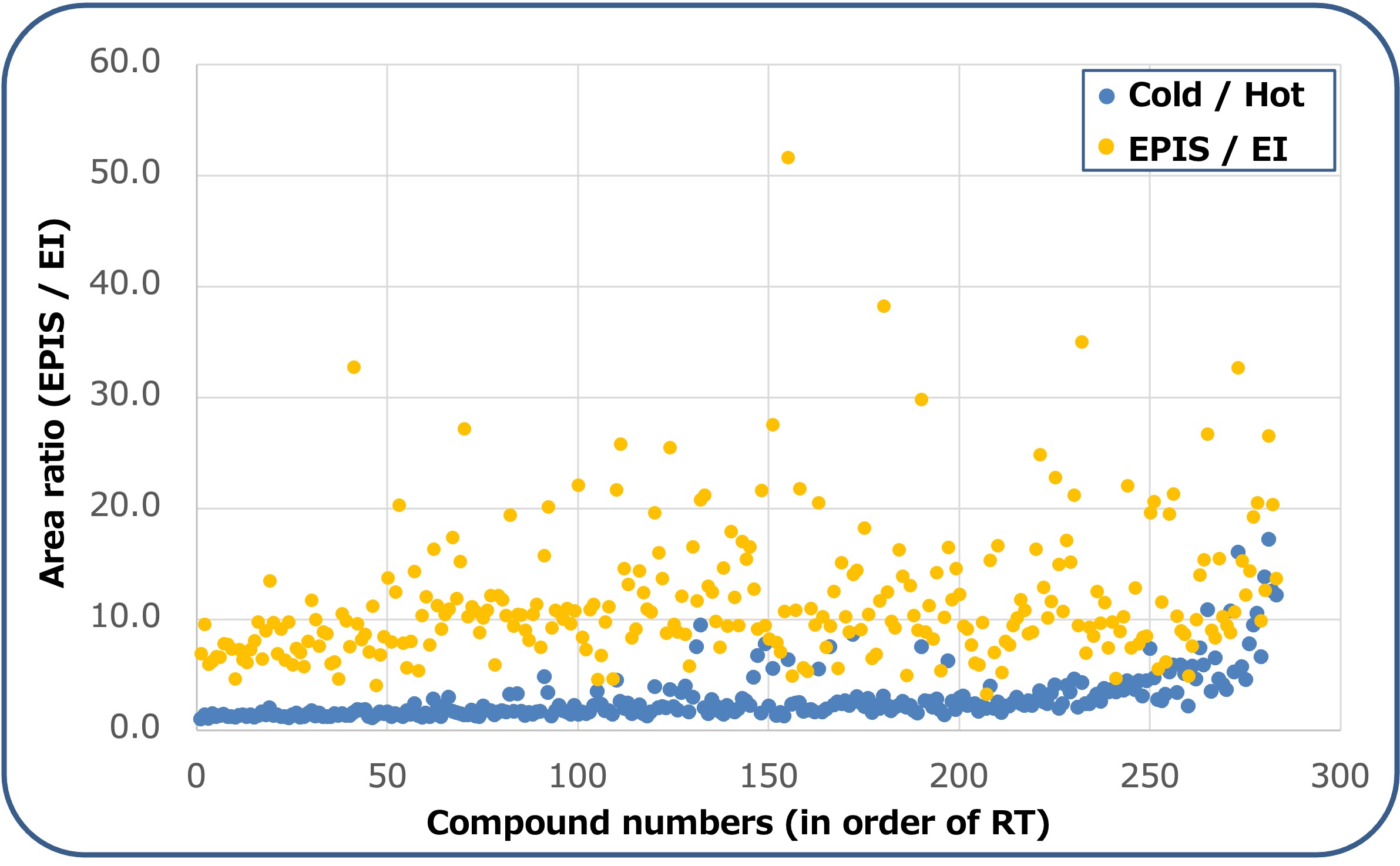 此外,为了确认应用EPIS的灵敏度改善效果,计算了两种模式下在01 ppb下可检测的283种组分的峰面积比(EPIS /标准EI),并按化合物顺序(保留时间顺序)排列的散点图如图2所示。同时,MSTips No413(应用冷不分流引入)的测量结果方法)也显示。