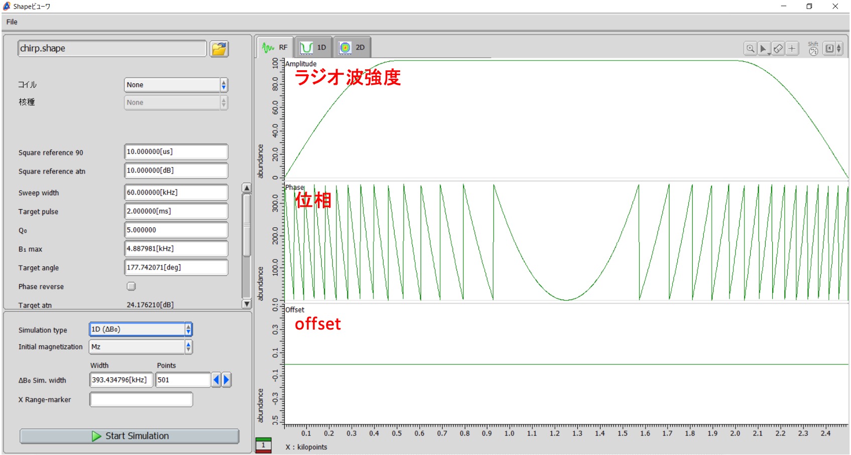 如果照射设定脉冲时无线电波强度发生偏差(ΔB1) 处的激励效率如何变化。图3显示了方波反转脉冲的1D(ΔB1) 显示激励曲线。横轴是电波强度的偏差(ΔB1/B1) 从顶部开始,显示相位 (deg)、横向磁化强度(x 磁化强度和 y 磁化强度的均方根)、x 磁化强度(绿色)和 y 磁化强度(红色)以及 z 磁化强度。由于我们施加了反转脉冲,即将z磁化强度旋转到-z的脉冲,因此该图中最重要的是z磁化强度,可以看出当无线电波强度发生变化时,激发效率显着降低。这样,一维模拟(ΔB1) 可以估计脉冲对无线电波强度偏差的耐久性。