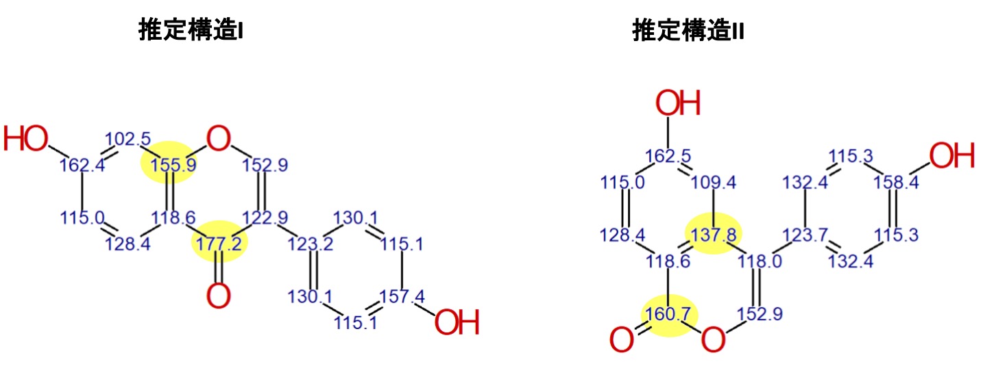 随着软件的进步,化学位移加和性可以被化学位移预测所取代。我们将 JASON 的化学位移预测应用于预测的结构 I 和 II(图 2)。估计的结构 II 是K和羰基碳M的预测值和测量值之间存在约 20 ppm 的差异。 (表 1)。估计结构I具有几乎相同的预测值和测量值。根据化学位移预测,预测的结构II的概率较低,预测的结构I被认为是正确的结构。