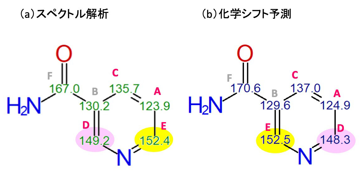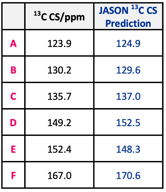 分子式为C6H6N2我们将介绍O化合物的分析示例。该化合物有一个基本的测量方法(1H,13C,部门,1H–13C HSQC,1H–1舒适,1H–13C HMBC) 和1H–15N 通过分析 HMBC,可以推导出估计的结构(图 1)。检查预测结构有效性的一种方法是使用化学位移值的加和性,但这可以用软件化学位移预测函数代替。我们将 JASON 的化学位移预测应用于图 1 中的估计结构。图1显示了测量值和预测值。由于测量值和预测值几乎匹配,因此获得的估计结构被认为是正确的结构。