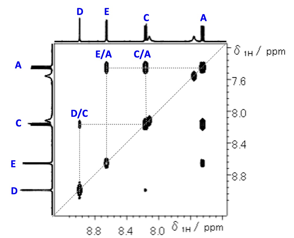 但是如果你仔细观察化学位移预测结果D和E的赋值是相反的(图2)。在这种情况下,请返回光谱并检查分析结果。在 COSY 谱中(图 3),E/A和C/A由于观察到相关性C-A-E1可以看到有一个H数组。由此,化学位移预测表明A和D彼此相邻是不正确的。如本例所示,化学位移预测需要在使用前进行光谱分析。如果结果出现差异,重新确认分析结果很重要。