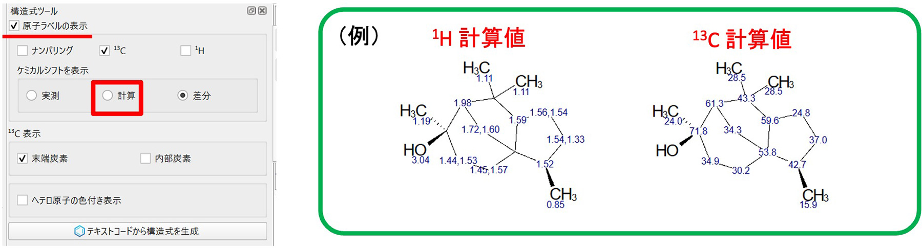 打开结构工具并选中“显示原子标签”。13C 或1如果您为 H 选择“计算”,则会显示每个化学位移的计算值。