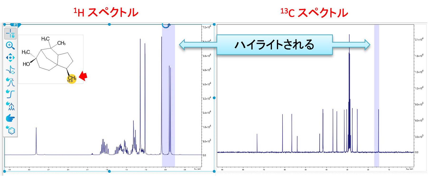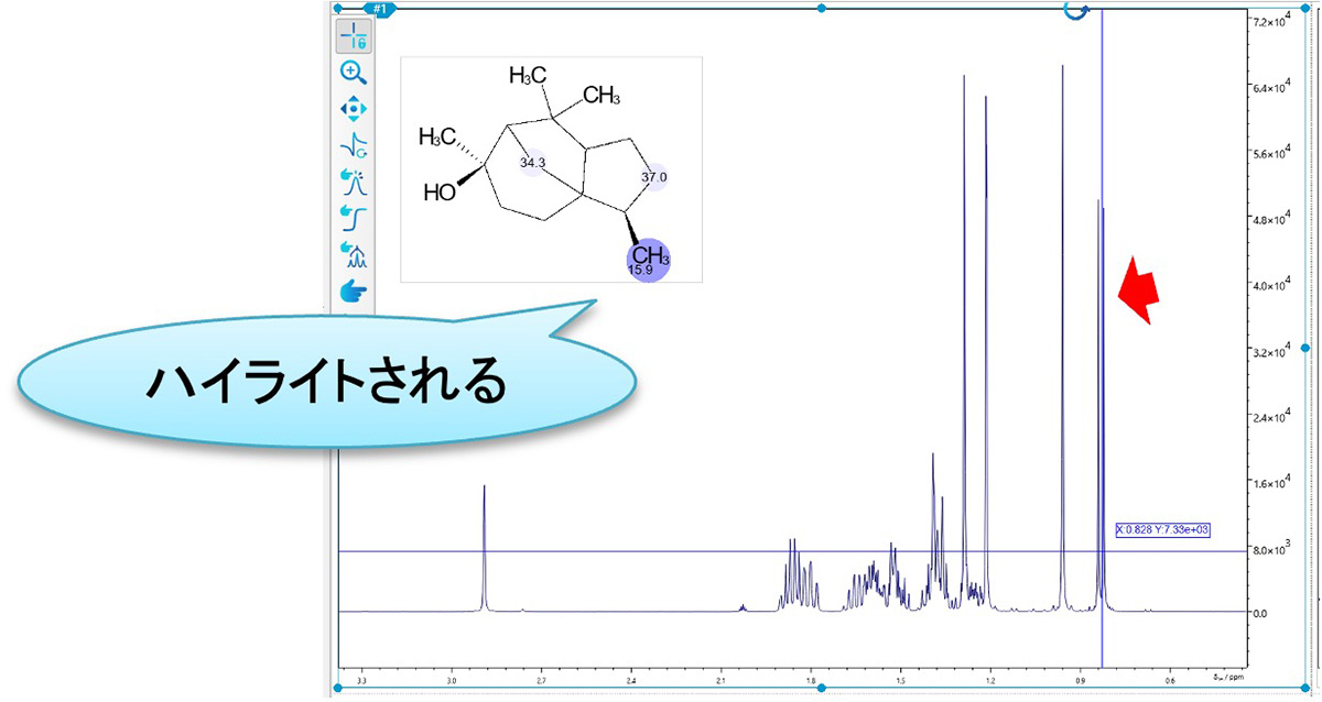 另一方面,将鼠标悬停在光谱的一部分上将突出显示根据该化学位移预测的结构。高光有阴影,颜色越深表示更接近计算值。