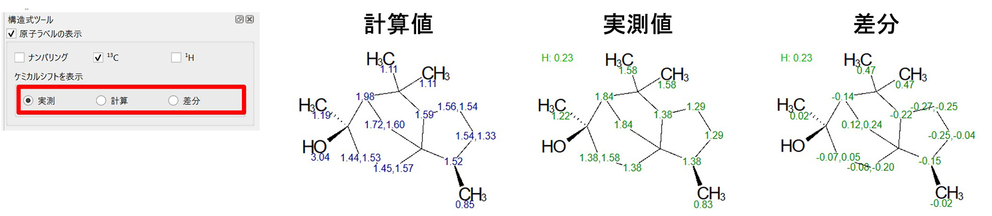 如果在结构式工具中选择[实际测量],则会显示指定的实际值,如果选择[差异],则会显示实际值与计算值之间的差异。