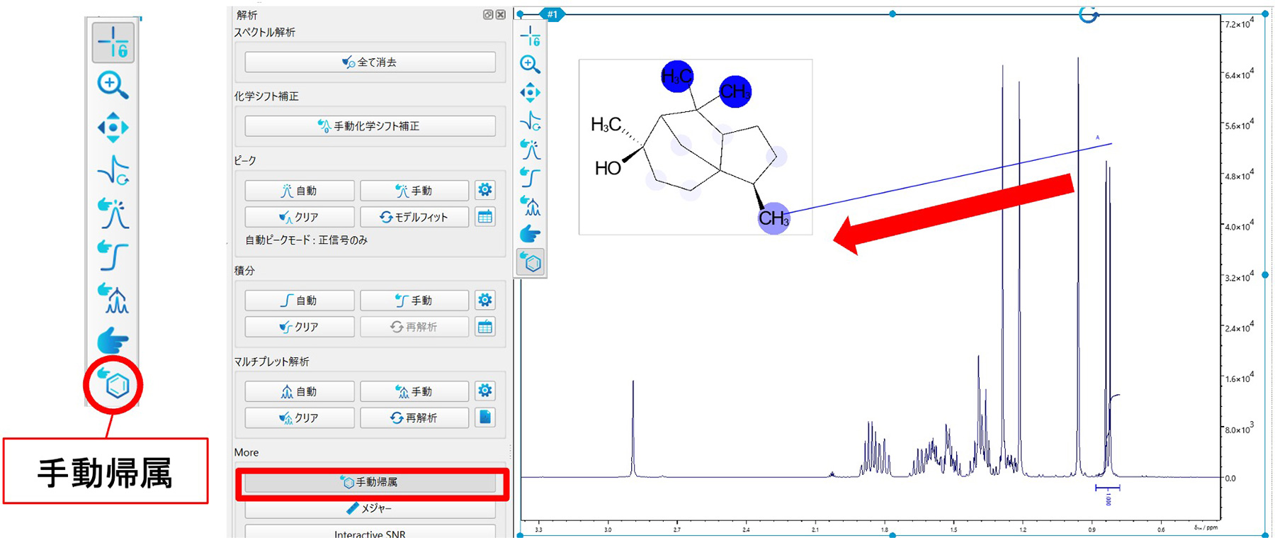 此外,可以一次手动完成一个峰的分配。您可以通过选择工具栏或分析选项卡页面上的[手动归因]并将相应的峰标签、积分值或多重条带拖至结构,将峰链接到结构。