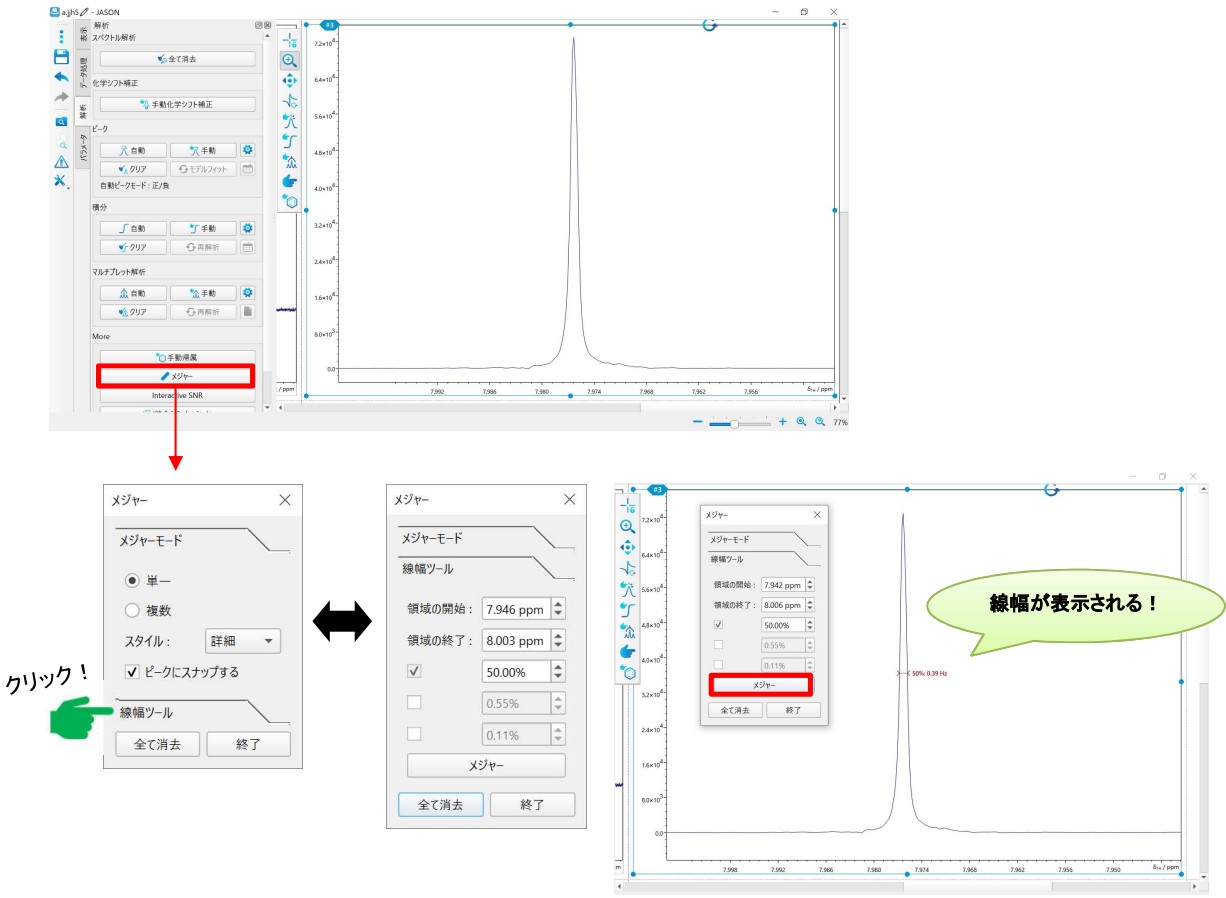 JASON 实现了“线宽工具”,可让您测量所需峰任意高度处的线宽(默认半宽(50% 高度))。