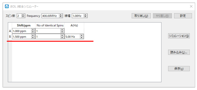 如果旋转次数为2(信号A和信号B的2个旋转系统),屏幕将如下图所示。因此,“位移/ppm”表示A和B的化学位移,“相同自旋数”表示各自的化学位移。1输入“A (Hz)”中 A-B 耦合的 H 分钟数和 Hz。然后将显示模拟结果。