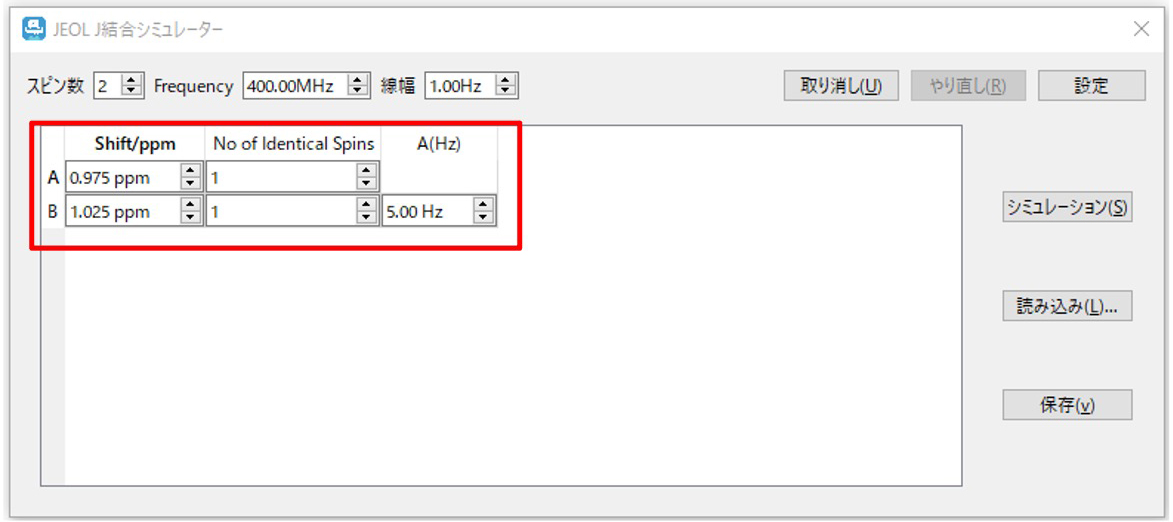 您可以通过在 J 耦合模拟器中选择“保存”,然后在下次启动此工具时选择“加载”,将旋转次数等条件返回到保存时的状态。